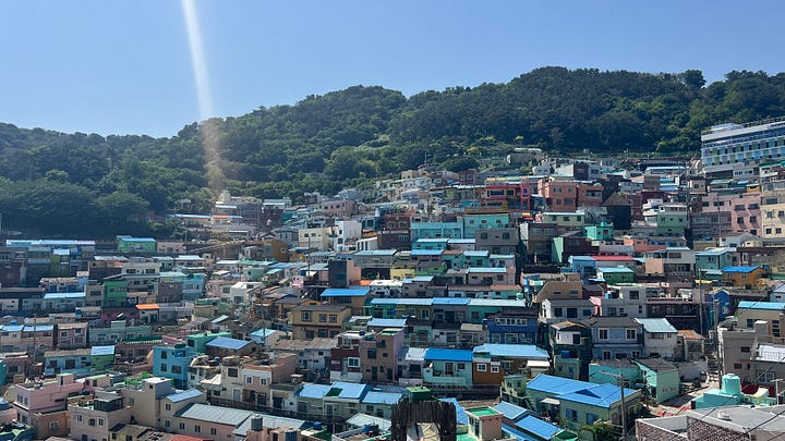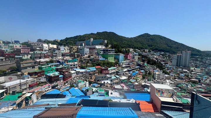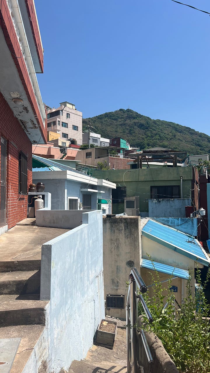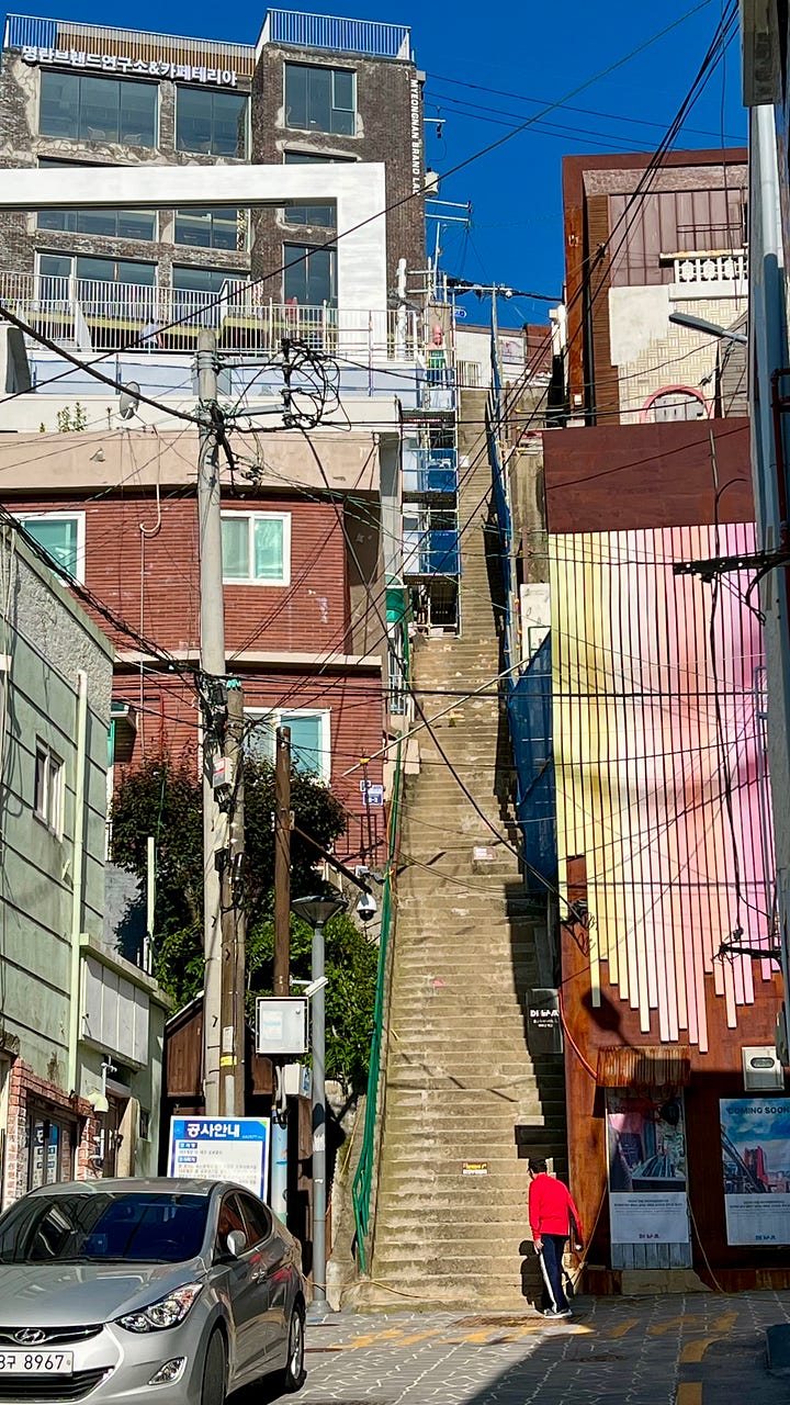 On the more touristic side of the coin, I also recently visited Gamcheon Culture Village. Took the subway, then walked a couple of Ks. This seems to be a pattern. It’s an interesting suburb. Houses and other buildings so close together that the “streets” are barely a meter wide. The only way to get around is on foot through the winding contour-paths and stairways. Lots and lots of stairs. In fact, there are lots and lots of stairs in Busan, once I got away from the coast, and that’s only like 1/2 kilometer. It’s definitely a tourist place, though. An americano, which I can get for 1800 KWN costs 4800 here. That’s a tourist price for sure.